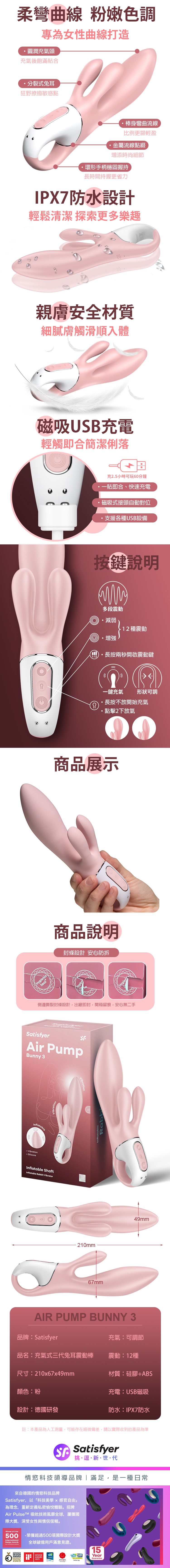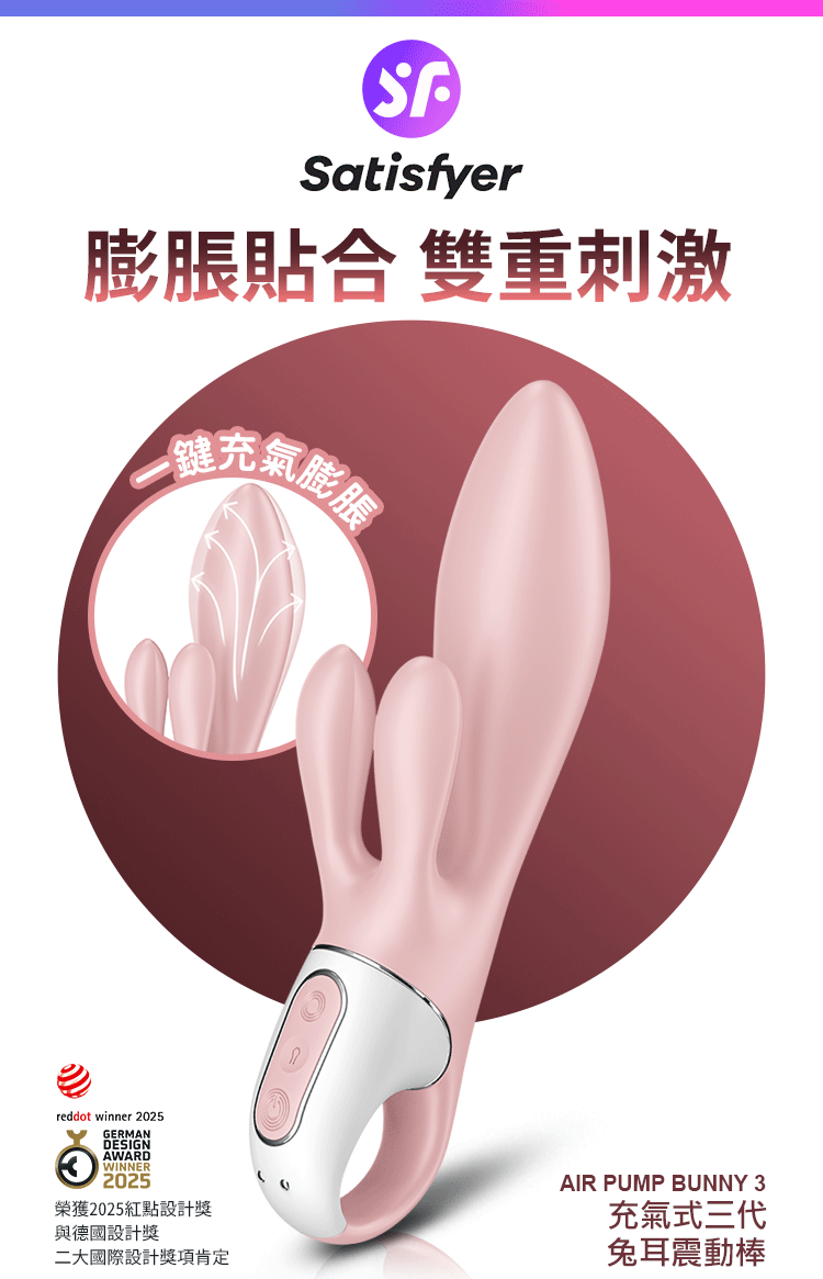 品名:Satisfyer|Air Pump Bunny 3|充氣式兔耳震動按摩棒 粉