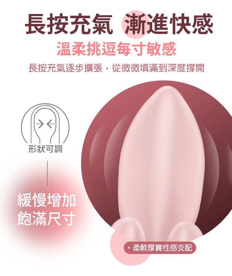輕按按鍵,頭部逐漸膨脹,貼合敏感區域,由內而外滿滿包覆。